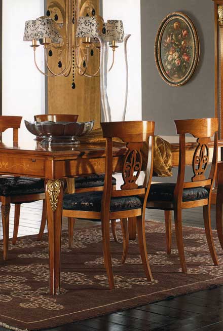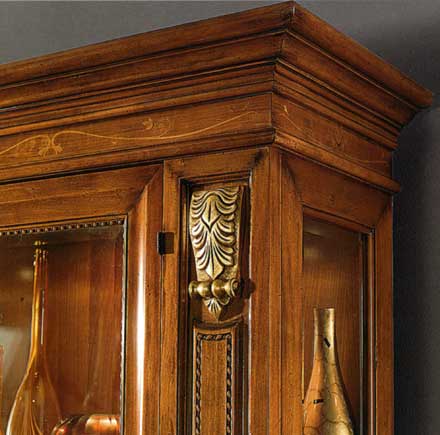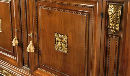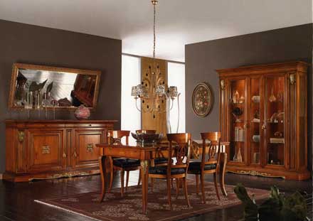 Гостиная «Джилио» итальянской фабрики «Stella del Mobile» выполнена из массива вишни и липы с эффектом старения. Резьба ручной работы, сусальное золото, нанесение вручную. Модульная программа. Стол — 108 800 руб. Стул — 27 800 руб. Стул-кресло — 36 200 руб. Витрина — 214 500 руб. Комод — 198 500 руб.